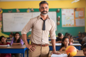 indian male teacher physical education confident blurred background work school sports fitness healthy exercise gym whistle clipboard stopwatch whistle uniform sneakers coach mentor leader inspiration role model student athlete classroom playground field gym court workout training instruction motivation encouragement success achievementImagine Buddy