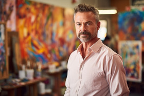 confidant male art teacher work blurred background classroom easel canvas brush palette paint painting lesson instruction guidance creativity inspiration expression passion dedication skill knowledge expertise professionalism mentor role modelImagine Buddy