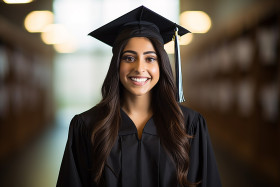 indian female graduate student work blurred background education career success happy smiling friendly young adult person woman university college graduate school employment business job occupation opportunity future bright positiveImagine Buddy