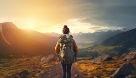 Woman hiking in mountains at sunset, adventure travel stock images, adventure travel ai prompts, travel stock images ai