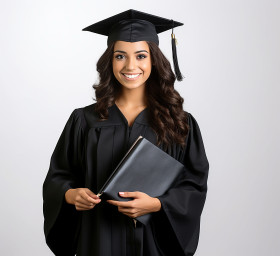 graduate student education achievement success female woman young adult happy smiling friendly joyful cheerful excited proud cap gown diploma scroll white background isolated headshot portrait academic university college commencement graduation celebration future career employment success bright future potential intelligence knowledge education empowerment inspirationImagine Buddy