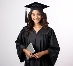 graduate student education achievement success female woman young adult happy smiling friendly joyful cheerful excited proud cap gown diploma scroll white background isolated headshot portrait academic university college commencement graduation celebration future career employment success bright future potential intelligence knowledge education empowerment inspirationImagine Buddy