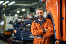 Skilled bus mechanic working with a smile against a blurred background