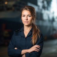 transportation models woman captain ship maritime nautical marine leadership authority command control navigation helm bridge uniform professional career success determination confidence strength empowerment blurred background focus work occupation profession industry transportation logistics travel adventureImagine Buddy