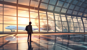 Man checking in for flight with suitcase, adventure travel stock images, adventure travel ai prompts, travel stock images ai