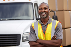 transportation models delivery driver courier logistics transportation service professional uniform confident smiling happy man worker employee occupation job profession blurred background urban city street busy active lifestyleImagine Buddy