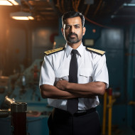 transportation models captain maritime marine nautical seafarer sailor navigator helmsman officer leader authority command control bridge ship vessel boat yacht cruise freighter tanker navy merchant marine uniform insignia epaulettes stripes hat peaked cap confident assured determined focused professional experienced skilled competent indian ethnicity nationalityImagine Buddy