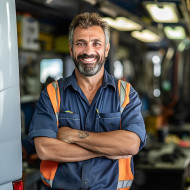 Smiling bus mechanic working against a blurred background