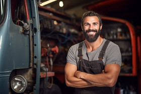 Cheerful bus mechanic repairing vehicle against a blurred background