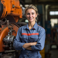 transportation models woman engineer locomotive train conductor transportation railway profession career workplace uniform cap smiling friendly happy confident blurred background portrait headshot occupation skilled professional female success industry indoors control panel indoors leadership focused determined capableImagine Buddy