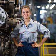 Cheerful female train driver working against a blurred background
