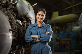 transportation models aviation mechanic aircraft engineer female woman india indian professional occupation skilled labor aerospace maintenance repair service tools uniform safety goggles hardhat smiling friendly confident happy workplace hangar blurred background portraitImagine Buddy