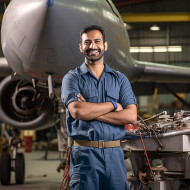 transportation models aviation airplane mechanic engineer maintenance repair service professional worker job occupation uniform tools safety expertise skill knowledge experience dedication passion pride satisfaction smile friendly approachable helpful reliable trustworthy indian ethnicity diversity representation inclusion blurred background focus concentration dedicationImagine Buddy