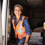 transportation models transportation trucking logistics female woman driver truck profession career workplace steering wheel uniform cheerful happy confident friendly smile blurred backgroundImagine Buddy