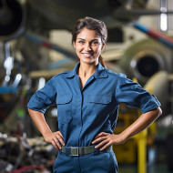 transportation models aviation aircraft mechanic female woman engineer technician maintenance repair work professional skilled confident friendly smiling happy cheerful positive blurred background hangar airport aerospace industry career diversity inclusion representationImagine Buddy