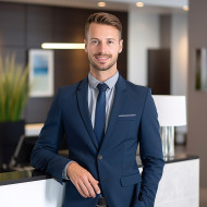 receptionist man confident work blurred background office desk computer phone headset smile suit tie happy smiling focused attentive helpful customer service reception business professional blur background workplace employeeImagine Buddy
