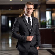 concierge man confident work blurred background hotel hospitality service professional customer service assistance reception luxury lifestyle business travel tourism accommodation greeting welcome help information support friendly approachable reliable trustworthy efficientImagine Buddy