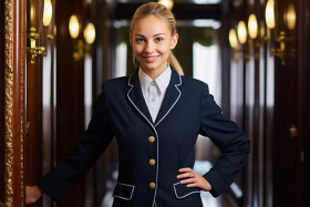 doorman woman friendly smiling work blurred background uniform hat badge hotel lobby receptionist welcome guest assistance luggage service professional courteous helpful friendly face smileImagine Buddy
