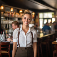 friendly smiling woman waiter at work blurred background restaurant service hospitality food drink menu order customer happy cheerful positive friendly professional uniform apron tray smile laughing joy happiness cheerful positive satisfied contentImagine Buddy