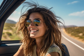 lady road trip california coast scenic captivating driving convertible sunglasses smiling happy freedom adventure vacation travel beach ocean sunset sunrise palm trees redwood trees cliffs mountainsImagine Buddy