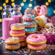 celebration party favors treats table decorations display buffet candy sweets snacks cake cupcakes cookies brownies popcorn chips dip drinks balloons streamers confetti tableware tablecloth napkinsImagine Buddy