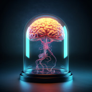 A brain encased in a glass dome floating in a tank of liquid, hu