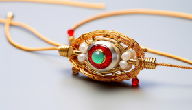 A gold rakhi made with red rakhi and red beads