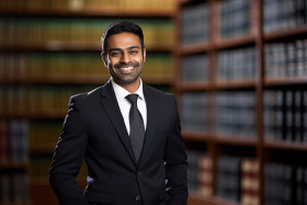 Helpful indian paralegal assists clients with a smile on blurred background