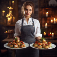 restaurant model chef culinary cuisine gourmet appetizer presentation stylish fashionable confident proud restaurant kitchen cooking food meal elegance luxury success achievement celebration artistry creativity passion expertise experience professionalism hospitality service industry business marketing advertisingImagine Buddy