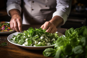 restaurant model chef cuisine garnish plating food cooking restaurant kitchen fresh herb decoration presentation culinary art skill precision attention detail professional expertise quality healthy delicious appetizing gourmet garnishing meticulous embellishmentImagine Buddy