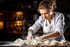restaurant model baking breadmaking chef culinary dough flour food hands kitchen kneading preparation process recipe woman cooking homemade artisan bakery bread cheflife culinaryarts doughkneading flourdusted foodie handson kitchenlife kneadingdough preparation process recipe womanchefImagine Buddy