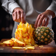 Bartender expertly cuts a juicy pineapple for a refreshing tropical drink