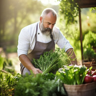 restaurant model culinary chef cooking garden herbs fresh organic harvest gardening healthy food ingredients preparation restaurant meal cuisine flavor aroma nature outdoors sunlight basket apron hands picking selecting harvesting trimming chopping basil parsley rosemary thyme mint oreganoImagine Buddy