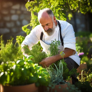restaurant model culinary chef cooking garden herbs fresh organic harvest gardening healthy food ingredients preparation restaurant meal cuisine flavor aroma nature outdoors sunlight basket apron hands picking selecting harvesting trimming chopping basil parsley rosemary thyme mint oreganoImagine Buddy