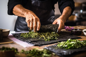 restaurant model sushi chef cooking cuisine japanese food preparation nori seaweed hand roll bamboo mat kitchen skills technique delicacy fresh healthy asian man handsome focused professional traditional art culinary precision detail expertise mastery craftsmanshipImagine Buddy