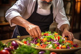 restaurant model chef cuisine gourmet culinary food salad plating colorful fresh healthy vegetables fruits presentation artistry skill expertise finesse elegance suave professional restaurant kitchen cooking preparation garnish drizzleImagine Buddy