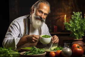 restaurant model chef cook kitchen restaurant food soup garnish basil herb fresh healthy gourmet culinary meal preparation cooking presentation plating garnishing finishing touch professional expertise skill handsome attractive man male portrait close-up detail focus selective blur bokehImagine Buddy