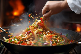 Skilled chef expertly stir fries vegetables in a wok