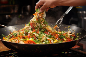 Skilled chef expertly stir fries vegetables in a wok