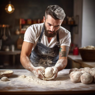 restaurant model baking bread artisan bakery chef cooking dough flour hands kneading man attractive handsome kitchen preparation process recipe rustic homemade traditional organic fresh healthy lifestyle culinary skills passion creativity art food delicious nutritionImagine Buddy