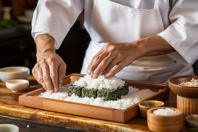 restaurant model chef sushi rice precision preparation skill technique japanese cuisine restaurant kitchen professional focused concentrated attention to detail dedicated passionate artistry culinary craftsmanship delicacy perfection food cooking asian man handsome attractive focused meticulousImagine Buddy
