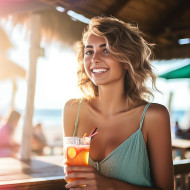 Elegant lady enjoying a refreshing drink at a seaside bar