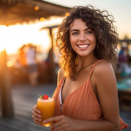 Elegant lady enjoying a refreshing drink at a seaside bar