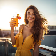 Smiling woman enjoying a refreshing cocktail at a rooftop bar