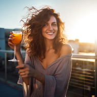 Smiling woman enjoying a refreshing cocktail at a rooftop bar