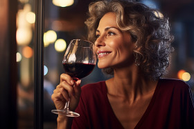restaurant models sophisticated stylish woman female solo alone enjoying relaxation leisure wine glass red white bistro restaurant cafe eatery interior ambiance mood lighting evening night urban city lifestyle pleasure indulgence celebration happiness contentmentImagine Buddy