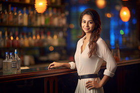 restaurant models woman manager bar hospitality workplace professional confident indian ethnicity diversity portrait blurred background restaurant beverage alcohol service industry leadership success career entrepreneur business owner boss lady female portrait headshotImagine Buddy