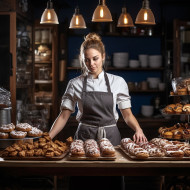 restaurant models chef woman pastry baking kitchen cooking professional skilled focused determined passionate culinary art creativity dessert sweets cake cookies bread food preparation restaurant bakery workplace indoors blurred background portrait occupation career success ambition expertise masteryImagine Buddy