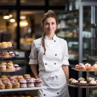 restaurant models chef woman pastry baking kitchen cooking professional skilled focused determined passionate confident success career ambition food dessert bakery restaurant workplace indoors blurred background portrait headshot occupation culinaryImagine Buddy