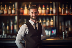 Assured bar manager oversees operations against a blurred background